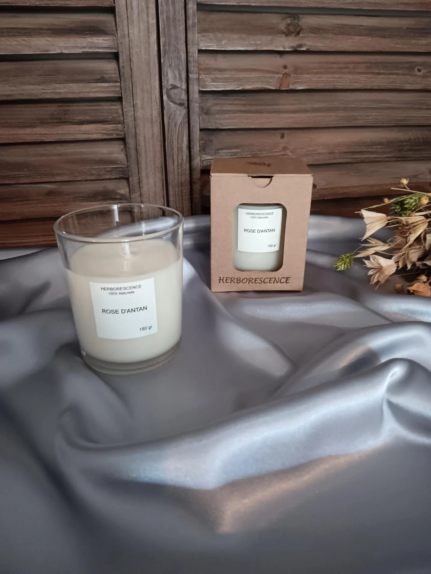 Bougie Rose D'antan 100% cire de soja naturelle sans OMG ,ni pesticides aucune matière animale , entièrement coulée à la main, longue durée de combustion.